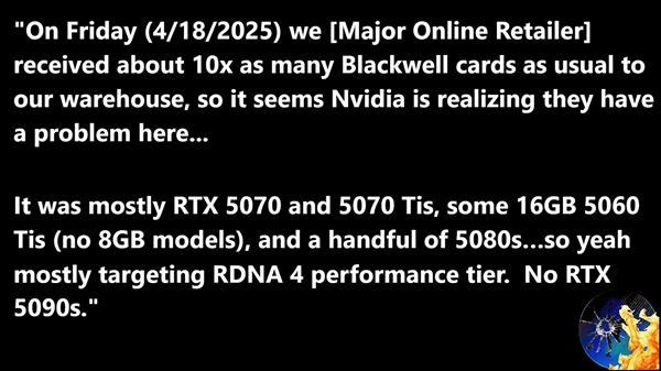 NVIDIA的新一代RTX 50系列显卡已经全面上市,但供应一直紧张,且存在较大幅度的溢价。最近有消息称,NVIDIA已大幅增加了RTX 50系列显卡的供应。一家主要在线零售商在4月18日收到了平时十倍数量的RTX 50系列显卡,包括RTX 5070、RTX 5070 Ti、RTX 5060 Ti 16GB以及部分RTX 5080。