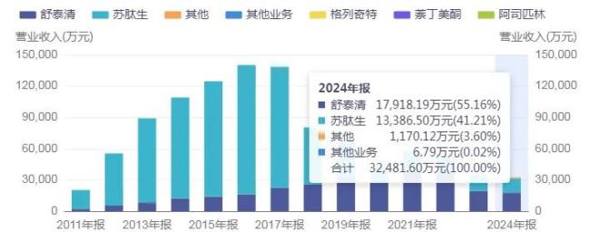 2024年,舒泰清和苏肽生合计贡献了96.37%的营收。其中,舒泰清占比55.16%,实现销售收入1.79亿元,较去年同期下降8.2%;苏肽生占比41.21%,实现销售收入1.34亿元,较去年同期下降17.3%。