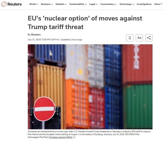 路透社提到,针对特朗普政府威胁8月1日起对欧盟进口商品加征30%关税,ACI清单列有十项反制措施。除货物关税外,还包括配额许可等进出口限制。