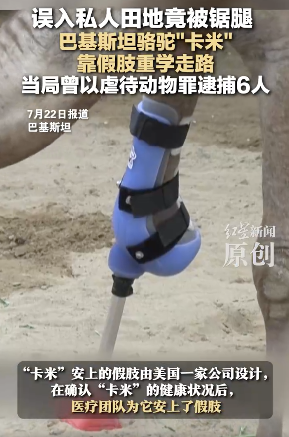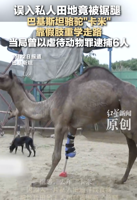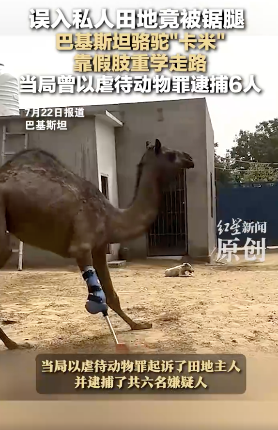 巴基斯坦骆驼误入私人田地被锯腿。误入私人田地竟被锯腿巴基斯坦骆驼“卡米”靠假肢重学走路当局曾以虐待动物罪逮捕6人!7月22日(报道),巴基斯坦一头名叫“卡米”的断腿骆驼,在动物收容所工作人员的帮助下,安上了假肢并迈出了“新生第一步”。据悉,去年“卡米”因闯入一片私人田地寻找食物,被这片田的主人用利器锯断了前腿。此事引发巴基斯坦国内强烈抗议,当局以虐待动物罪起诉了田地主人并逮捕了共六名嫌疑人。“卡米”安上的假肢由美国一家公司设计,在确认“卡米”的健康状况后,医疗团队为它安上了假肢。“它真的像个紧张又害怕的孩子。”在看到“卡米”重新走路后,收容所负责人舍尔马·汗激动得哭了起来,“这就像梦一样”。报道称,“卡米”是巴基斯坦首个安装假肢的大型动物。