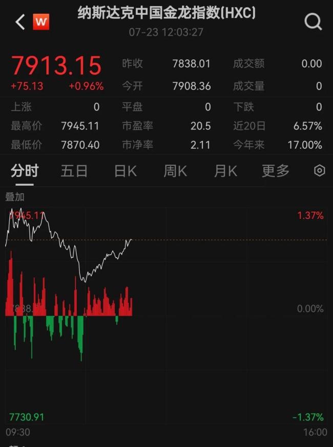 纳斯达克中国金龙指数涨近1%,小马智行涨超7%,世纪互联涨超6%,万国数据涨超4%,金山云、爱奇艺涨超3%。