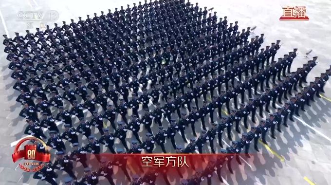 空军方队接受检阅。建设强大人民空军是党和人民的不懈追求。在战争年代孕育起航,在血与火的洗礼中发展壮大,人民空军向着空天一体、攻防兼备高飞奋进。