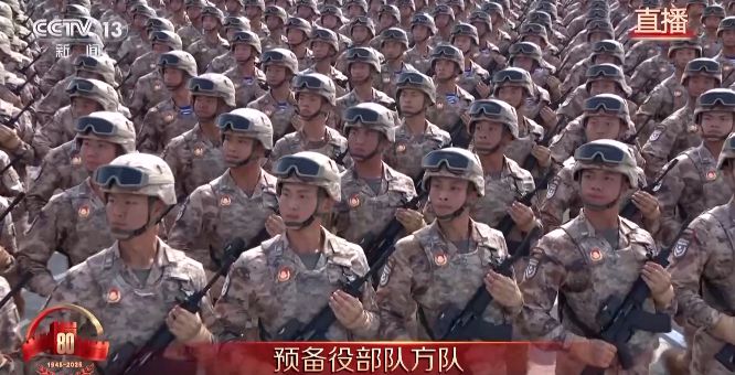 预备役部队方队接受检阅。新型预备役力量全面纳入军队领导指挥体系,姓军为战、常备不懈,与现役部队一体建设运用,共同履行新时代人民军队使命任务。