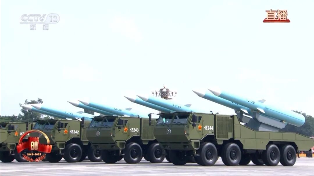 长缨在手,敢缚苍龙。巡航导弹方队采取海军、空军、火箭军联合编组模式,受阅的长剑-20A、鹰击-18C、长剑-1000导弹,是实施远程精确打击、多域慑战制胜的“点穴”利器。