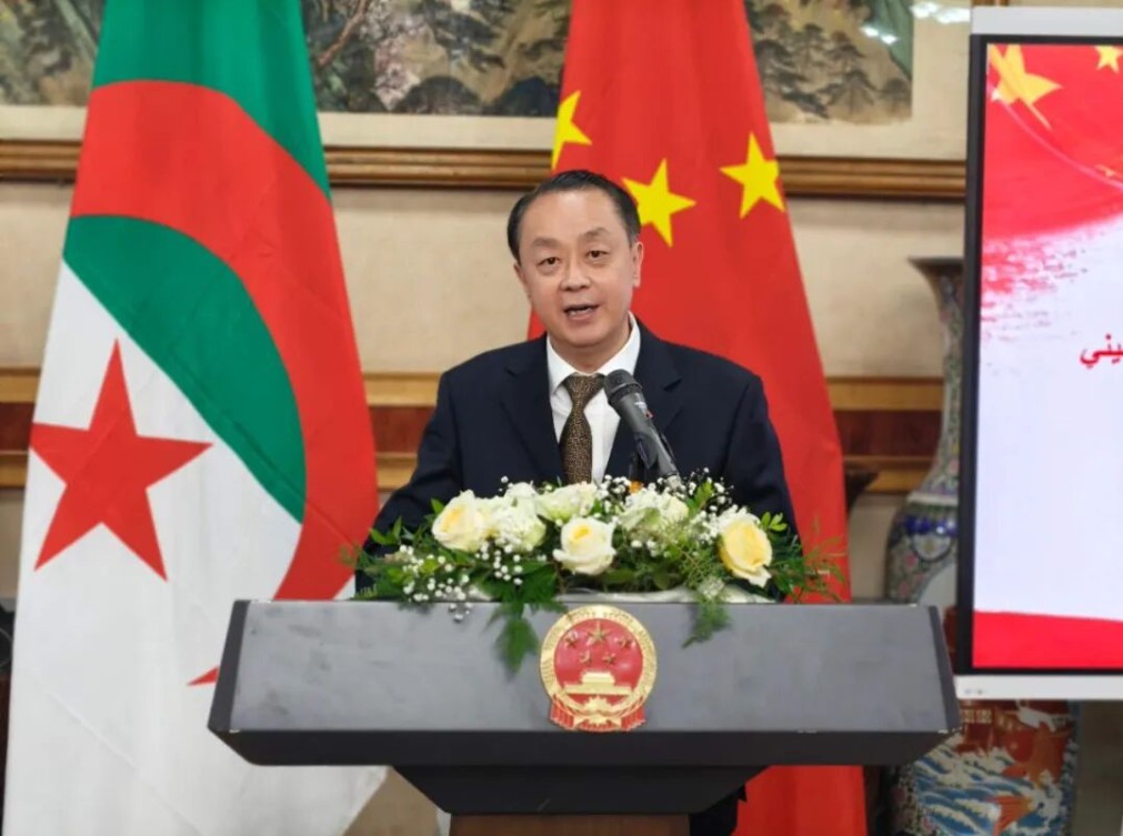 中国驻阿尔及利亚大使董广利致辞。中国驻阿尔及利亚大使馆供图