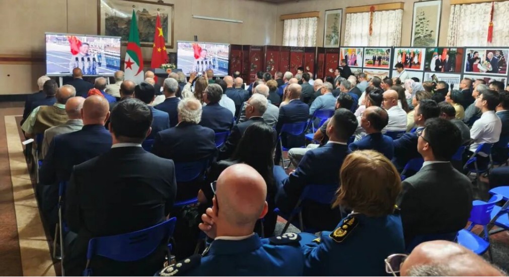 与会来宾一同观看了中国人民抗日战争暨世界反法西斯战争胜利80周年纪念大会视频和《东方主战场》专题片,参观了“弘扬伟大抗战精神”主题图片展。现场还首映了60年前曾在华培训的阿尔及利亚老战士访华纪录片,影片中,老战士们重返故地,深情回忆在中国接受培训的点点滴滴。