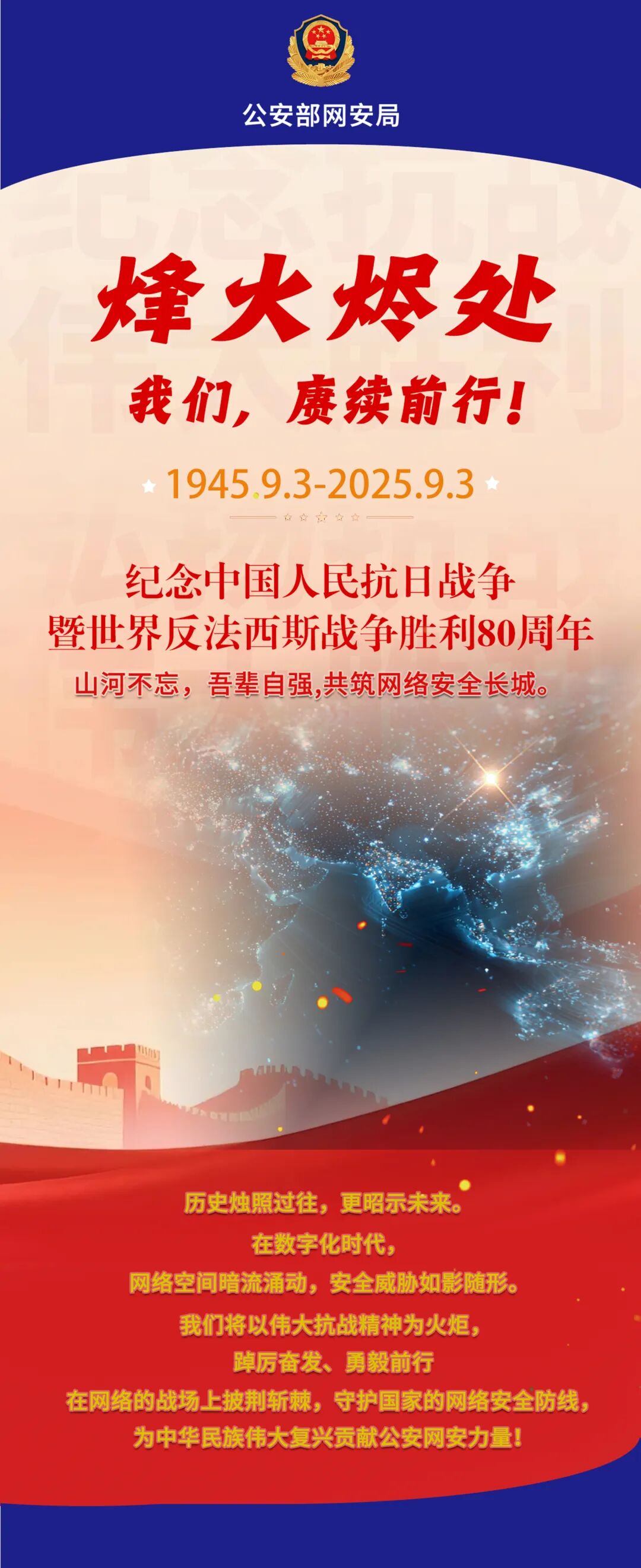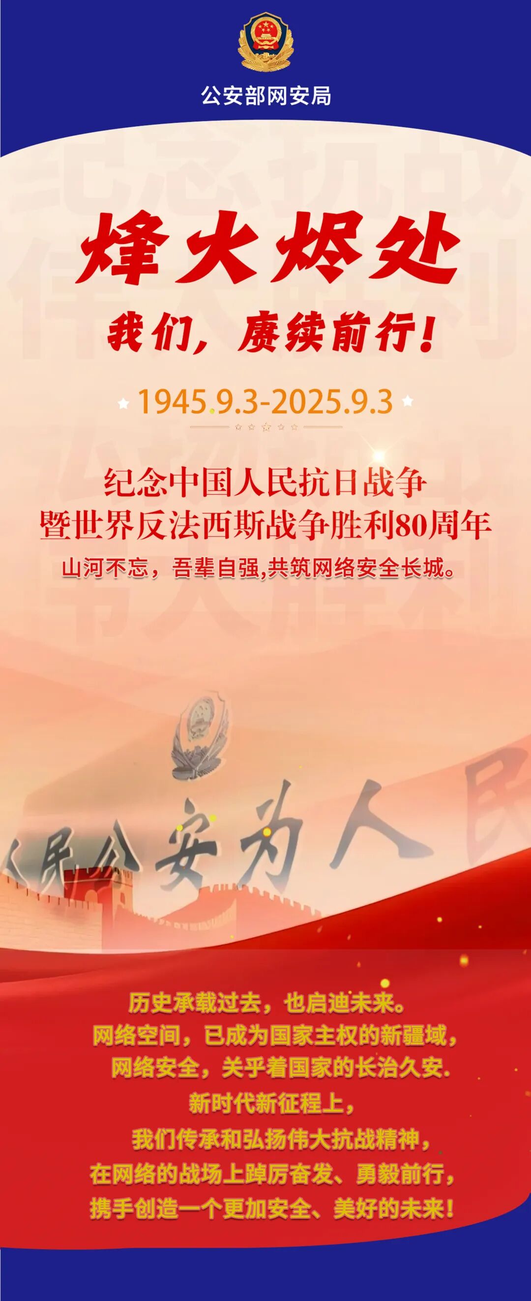 中国网警:烽火烬处赓续前行。2025年9月3日,纪念中国人民抗日战争暨世界反法西斯战争胜利80周年大会举行,山河不忘,吾辈自强,共筑网络安全长城。烽火烬处,我们,赓续前行!