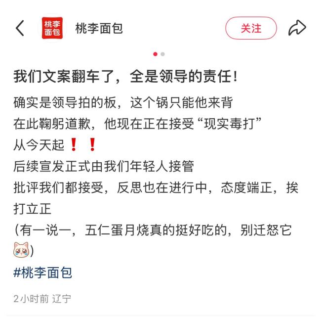 桃李面包针对“桃李蛋月烧”月饼电梯广告争议,于9月5日在其官方账号上发布声明。声明中表示,该广告确实由公司领导决策,并为此道歉。声明还提到,从即日起,后续的宣发工作将由年轻人接管。公司接受所有批评并正在进行反思,态度端正。