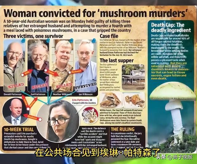 澳大利亚一女子用毒蘑菇杀公婆 被判三次终身监禁!9月8日,澳大利亚女子埃琳·帕特森因使用世界上毒性最强的蘑菇杀害三名午餐客人,被判处三次终身监禁,至少服刑33年不得假释。她在2023年故意采摘致命的死亡帽蘑菇,添加到午餐中,杀害了丈夫的三位亲人,被称为“蘑菇杀手”。此案引起极大关注,被称为“过去50年来澳大利亚最受关注的审判之一”。