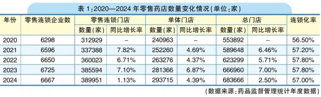 另外,2020—2024年药店连锁化率虽有一定提升,但不明显,基本保持在57%左右。可见,政策导向鼓励连锁企业做大,但连锁化管理半径过大,对企业运营的要求很高。随着头部连锁药店门店数相继突破万家,进一步提升连锁化率尚有一定难度。中国市场广阔,区域市场差异显著,大量单体药店仍有生存空间。