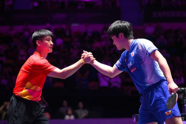 在澳门举行的2025年世界乒乓球职业大联盟(WTT)澳门冠军赛男子单打首轮比赛中,中国选手薛飞以3比0战胜日本选手张本智和,成功晋级16强。赛后,两位选手握手致意。