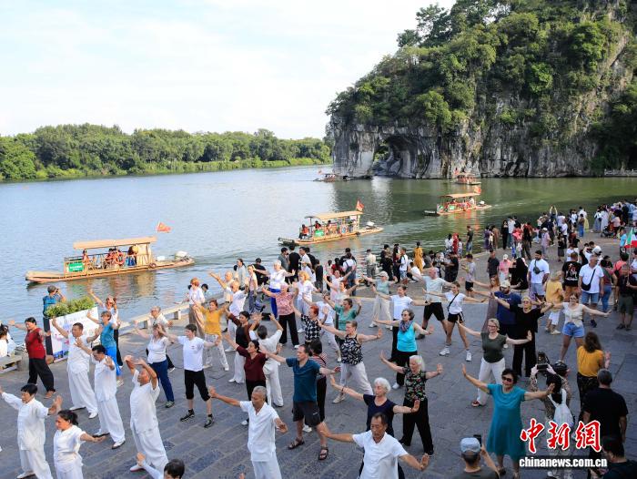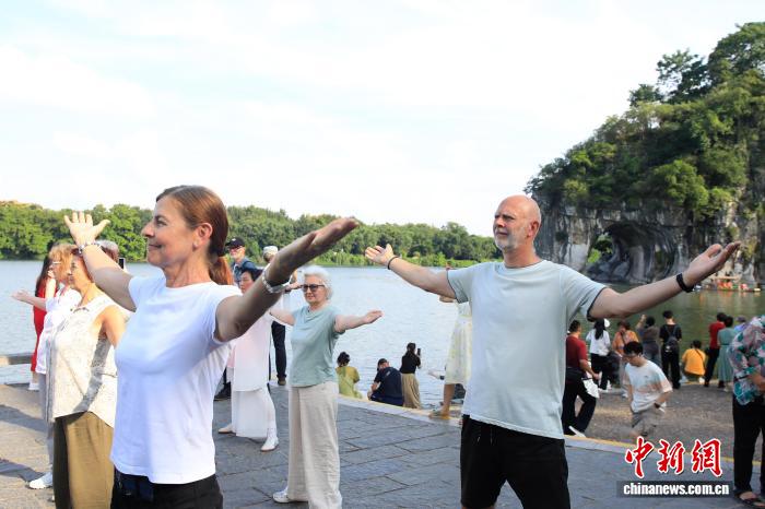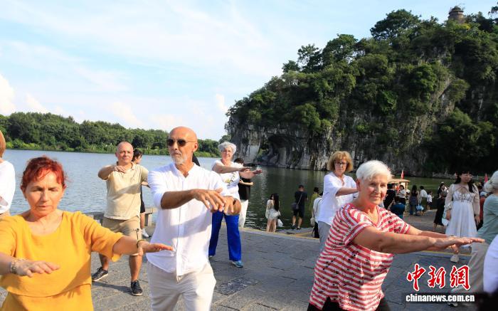图为中奥太极爱好者在象鼻山下合影留念。杨宗盛 摄