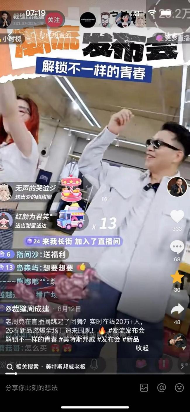 实际上,这场引发讨论的直播发生在一个多月前。8月9日,美特斯邦威在“裁缝周成建”的抖音直播间进行26春夏新品发布会。60岁的美邦服饰董事长周成建戴着黑色墨镜跳起团舞,背景音乐是品牌历史代言人周杰伦的《阳光宅男》。周成建抖音公布,当晚这场直播的在线观看人数超20万人。
