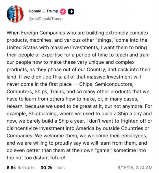 新华社北京9月15日电 美国执法人员抓捕300多名在美韩企韩籍员工并引发外交风波约10天后,美国总统特朗普14日发文说,欢迎外国企业带着专业技术人员赴美,并表示不希望“吓退”外国投资者。韩国总统李在明此前表示,“抓人”事件会让韩企对赴美投资感到犹豫和忧虑。