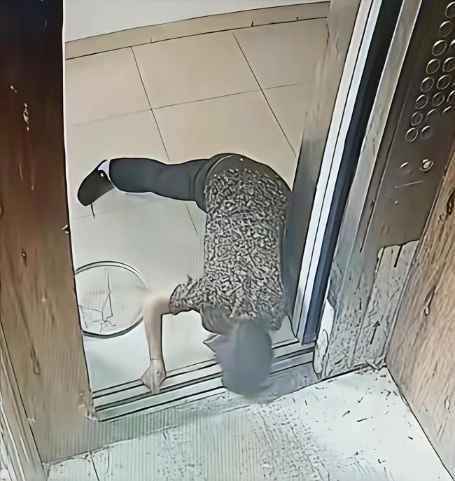 找了半天没找到,大娘站起来愣了几秒,突然又把箩筐放回电梯门中间,这步操作倒不算错,毕竟刀卡在里面,万一有人不知情按了电梯,很可能引发故障。可接下来的举动却让人摸不着头脑:她把箩筐放好后,转身像是要去找人帮忙,结果没走两步又折回来,捡起箩筐跨进电梯,按下了一楼按钮。显然,大娘想坐电梯到一楼捡刀。但她没注意到,电梯门在闭合时已经出现异常——门体晃动、闭合速度变慢,这些都是故障的信号。然而大娘仿佛没看见,双手插在裤兜里,神态放松得像平常乘电梯一样,完全没有意识到危险正在靠近。