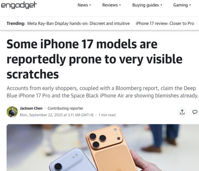 9月22日,据engadget援引彭博社报道,部分新发布的iPhone 17系列机型在零售展示及日常试用中出现了明显划痕。主要问题集中在深蓝色iPhone 17 Pro和深空黑色iPhone Air两款配色上。用户在社交媒体上发布照片显示,设备后置摄像头区域、MagSafe充电接触面及周边边角出现磨损痕迹,引发广泛关注。