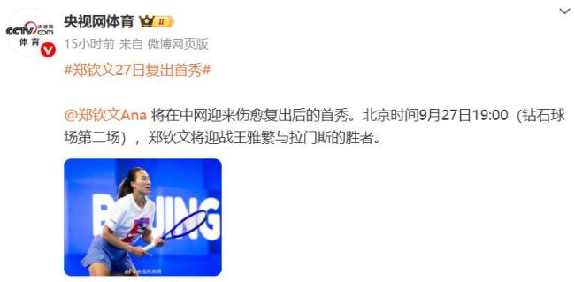 9月24日,中国网球运动员郑钦文确认将在中网迎来中国赛季的首秀。她将于9月27日登场,迎战王雅繁与拉门斯之间的胜者。这是她接受手肘手术后的复出首秀。