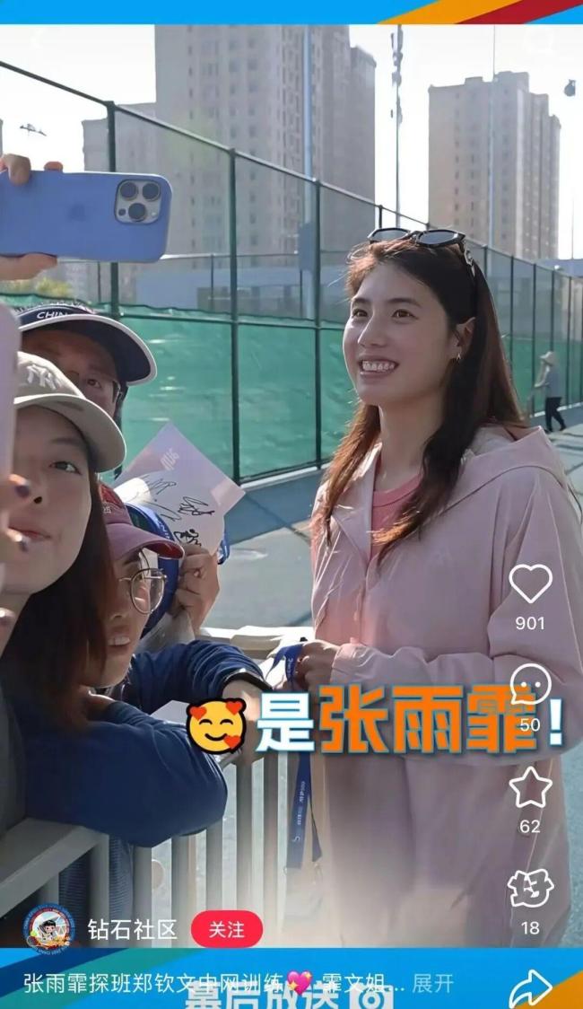 9月23日,中国游泳运动员张雨霏出现在郑钦文训练的网球馆外,观看她的训练。在去年的中国网球公开赛女子单打四分之一决赛中,郑钦文以2:1战胜米拉·安德列娃,而张雨霏当时作为挑边嘉宾现身赛场。
