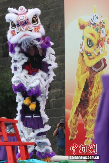 9月27日,在江苏南京举行的2025年世界华人狮王争霸赛传统南狮项目的比赛中,来自中国、新加坡、南非、美国等国家的参赛队伍轮番登台展绝活。图为南非开普敦华星龙狮团的成员在比赛中。中新社记者 泱波 摄
