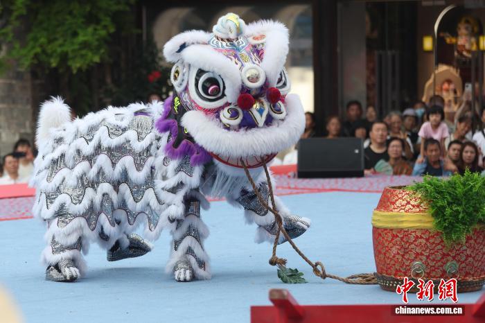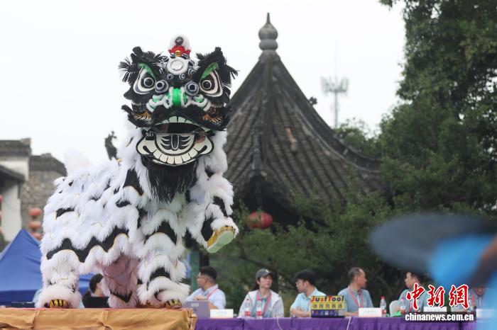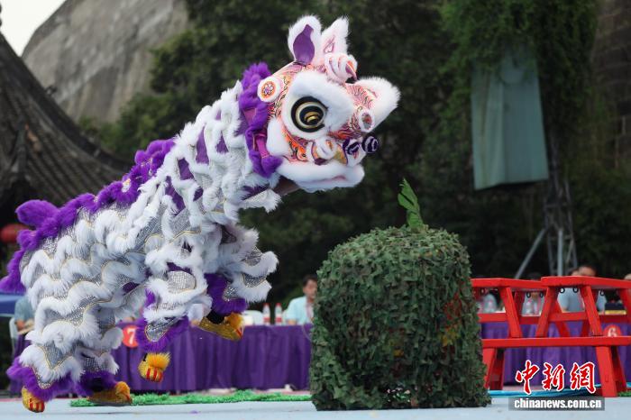 9月27日,在江苏南京举行的2025年世界华人狮王争霸赛传统南狮项目的比赛中,来自中国、新加坡、南非、美国等国家的参赛队伍轮番登台展绝活。图为深圳市宝安区西乡蚝业黄连胜醒狮团的成员在比赛中。中新社记者 泱波 摄