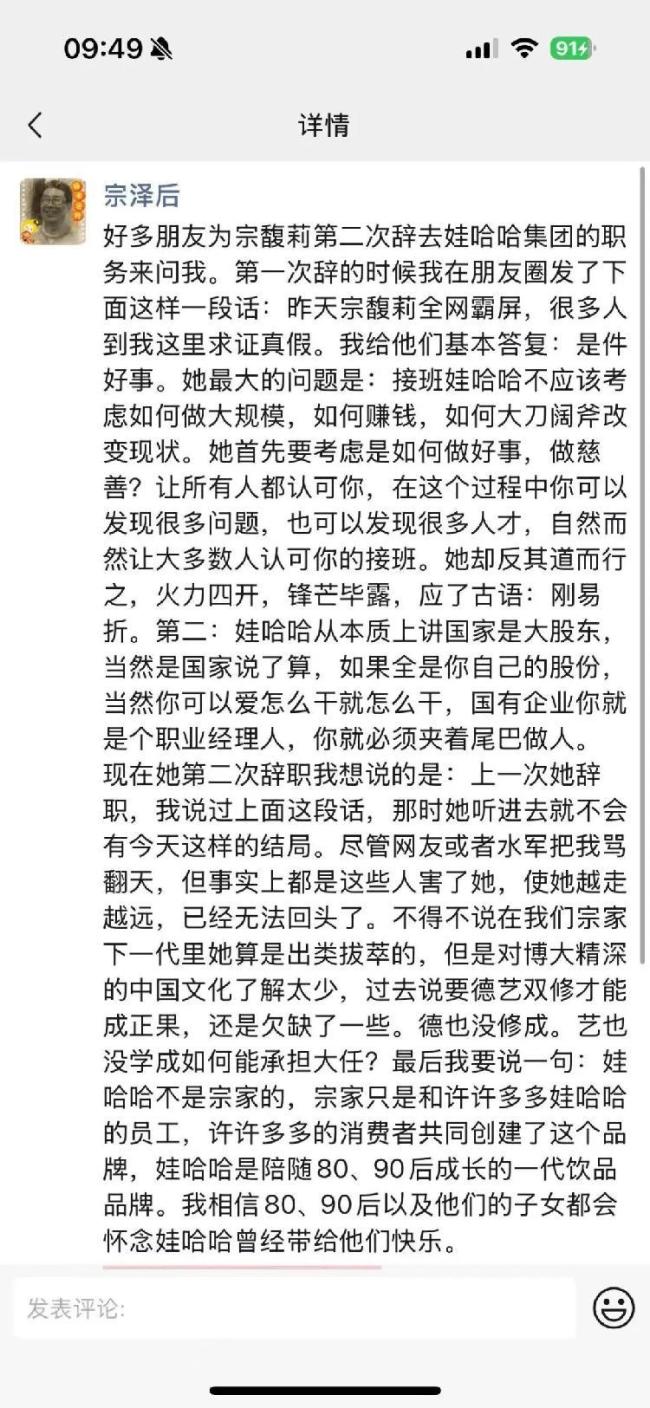 10月11日,宗馥莉的叔叔宗泽后在朋友圈回应了关于宗馥莉第二次辞职的消息。他表示,许多人询问他关于此事的看法。此前宗馥莉第一次辞职时,他曾表示这是件好事,并指出她最大的问题在于接班娃哈哈不应只考虑如何扩大规模、赚钱或大刀阔斧地改变现状,而应更多关注做好事和做慈善,赢得大家的认可。他认为宗馥莉的做法过于激进,违背了“刚易折”的古训。此外,他还提到娃哈哈本质上是国有企业,国家才是大股东,因此作为职业经理人需要谨慎行事。