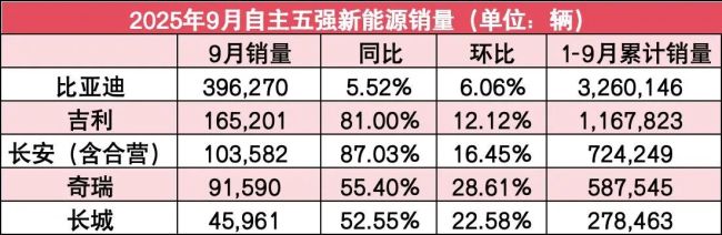首先,比亚迪销量为396270辆,同比下滑5.52%,环比增长6.06%。去年同期,比亚迪月销量近42万辆,这也是比亚迪自2024年3月以来首次出现单月销量同比下滑。实际上,从生产端来看,比亚迪销量从7月份就已经出现了同比下滑,已经连续3个月同比下滑。不过从规模来看,比亚迪依然是遥遥领先,今年1-9月比亚迪累计销量3,260,146辆,同比增长18.64%。