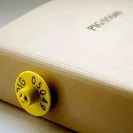 这本书的封面设计十分朴素,但它但书脊上装饰着一件不同寻常的东西:一个亮黄色的圆形塑料标签。这其实是一个耳标,它用在养殖场中,是一头猪活过的证明。而如果你从书架上抽下这本书,还会在它的封底看到一枚检疫章,这是一头猪死去的标志:它在屠宰场被宰杀,检疫合格,接下来就会变成商品进入市场。