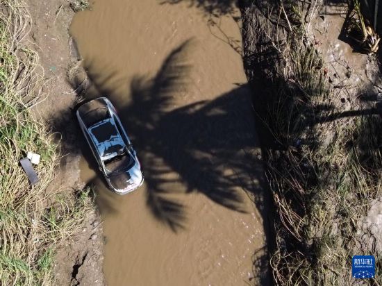 10月12日,在墨西哥韦拉克鲁斯州波萨里卡,一辆汽车陷在强降雨导致的积水中(无人机照片)。新华社发(弗朗西斯科·卡涅多摄)