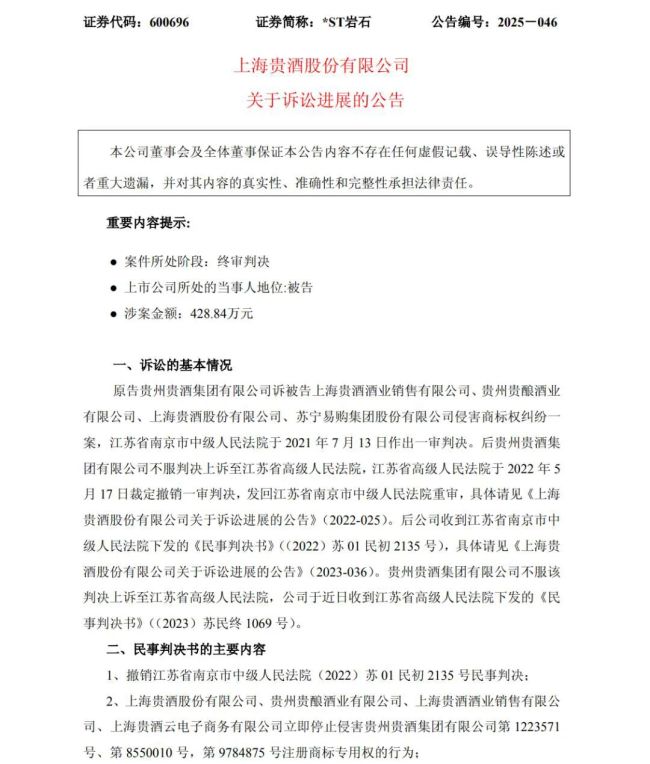 近日,上海贵酒(股票简称:*ST岩石)发布公告称,在与贵州贵酒集团有限公司(下称“贵州贵酒”)的侵害商标权纠纷一案中,*ST岩石被判决赔偿贵州贵酒经济损失及合理维权费用共计418.847万元,并立即停止使用贵州贵酒有一定影响的企业名称“贵酒”。
