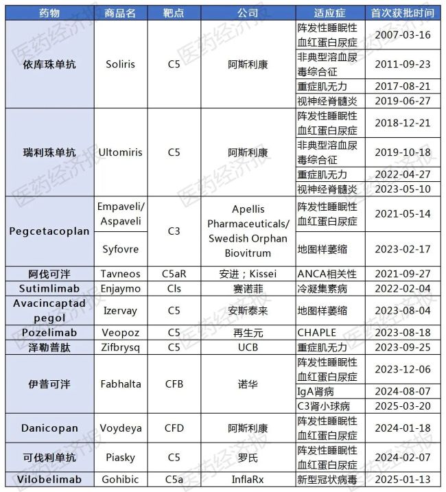 值得一提的是,补体药物适应症逐步从罕见病向常见病拓展,成为其市场规模不断扩张的重要诱因。今年上半年,诺华的补体因子B(CFB)抑制剂伊普可泮相继在美国和中国获批C3肾小球病(C3G)适应症,这是该药物继IgA肾病后在肾病治疗领域拿下的第2项适应症,据统计,这也是补体药物解锁的第11块疾病拼图。