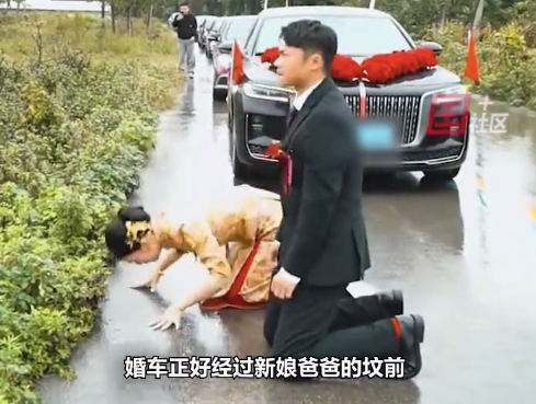 10月22日江苏徐州,一位新娘出嫁,婚车正好经过新娘爸爸的坟前,新娘带着新郎冒雨下车跪拜:我走了爸爸。摄影师:此情此景太触动人了,当时心里特别难受,心疼新娘。