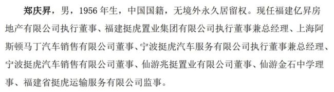 作为莆田市仙游县知名企业家,郑庆昇涉足房地产、汽车销售等领域,现任上海阿斯顿马丁汽车销售有限公司董事、金字火腿董事长等职。其家族是当地知名的豪车代理富商家庭,其80后儿子郑挺和90后儿子郑虎分别任上海阿斯顿马丁汽车销售有限公司董事长、董事职位,今年7月,郑虎出任金字火腿副总裁。