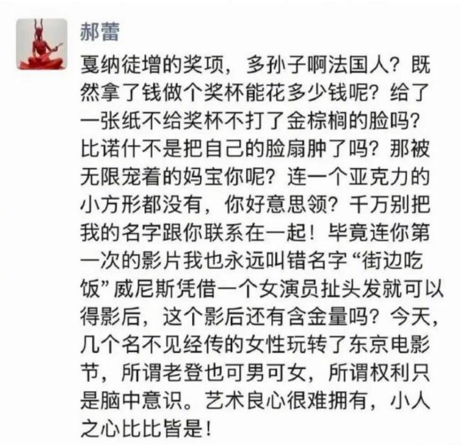 辛芷蕾还提到署名郝蕾的朋友圈内容,强调中国从不缺少优秀的演员,缺少的是让他们发光的故事。她为华语面孔在国际上被看到感到由衷高兴。