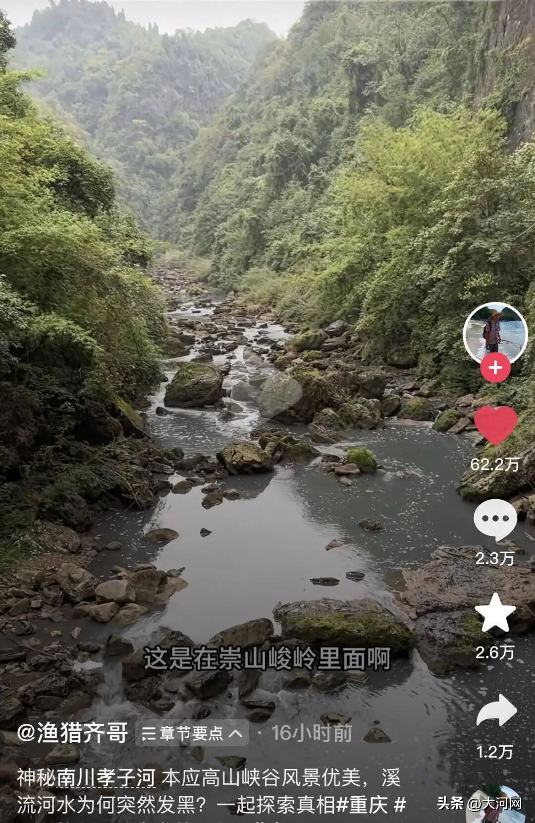 “渔猎齐哥”在短视频平台拥有300多万粉丝,他一直致力于环境污染曝光。视频中,他称接到粉丝求助,得知重庆市南川区孝子河河水污染。赶到现场后,他确实看到孝子河的河水污染严重。
