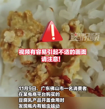 11月9日,广东佛山市一名消费者在某电商平台购买的豆腐乳产品开盖食用时,发现瓶内有蛆虫蠕动。
