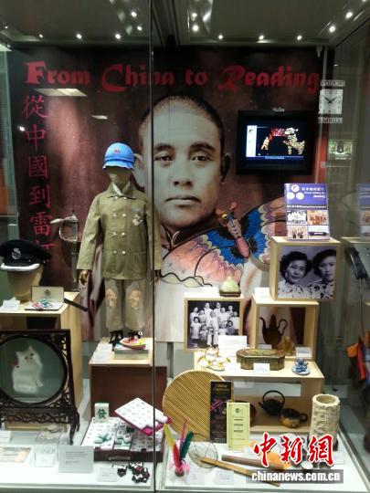 雷丁市博物馆内展出的杂志《从中国到雷丁》与英国早期华人移民使用过的老物件。(受访者供图)