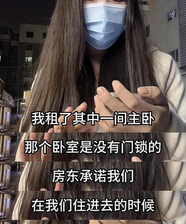 这个女生在沈阳租了一间合租房的主卧,每月租金1200元。房子是顶楼带阁楼的那种,房东自己住在阁楼上。看房时,女生发现她租的主卧没有锁,房东承诺搬进来后会装锁。但搬进去后,房东并没有履行承诺。由于没有门锁,一天她通过监控发现有两个陌生男子在她的卧室里指指点点。她质问房东,但房东却否认有人进入过她的房间。