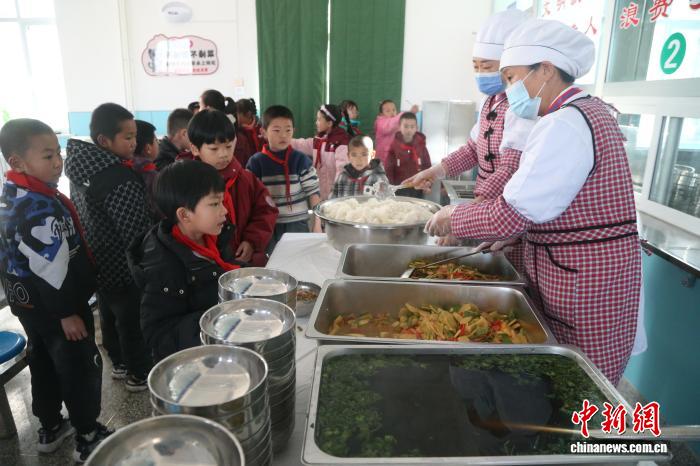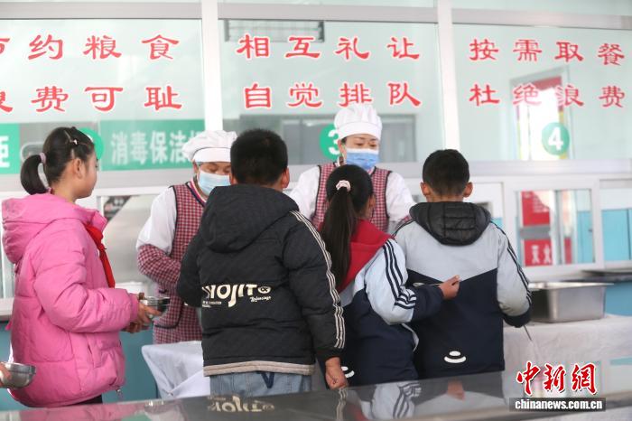 12月11日,在西宁市湟中区徐家寨小学,学生们正排队打饭。近日,青海农村义务教育学生营养改善计划实现扩面升级,享受补助的学生数量从25.83万名增至51.31万名,覆盖全省67.29%的义务教育阶段学生。张忠苹 摄