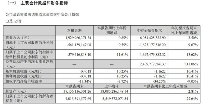 扣除非经常性损益-16.97亿元的净利润,同比上升13.62%。单季度来看,第三季度归母净利润为-5.61亿元,同比减亏近6000万元。