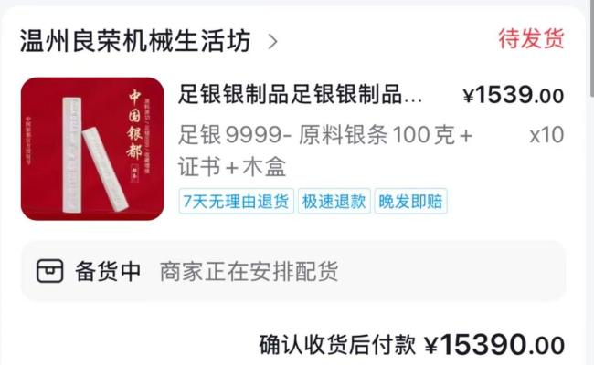 在平台购买银条后,徐先生遇到了一系列问题。12月25日,他在某平台的“温州良荣机械生活纺”店铺分四笔订单购买了2400克白银,共花费36836元。然而,下单后的第二天,店铺清空了所有商品,且人工客服联系不上。到了发货时间,商家仍未发货。徐先生表示,他购买时每克白银价格为15.19元,周末涨到了20.1元,而12月31日查询的价格为每克18.14元。