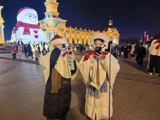 2日晚,哈尔滨音乐公园的“大雪人”前游客络绎不绝。一位身着雪人造型羽绒外套的女孩拿出20多套雪人斗篷,免费提供给游客拍照。这位女孩名叫张欣,是一名90后创业者,她已经连续三年为游客提供这种独特的拍照服装。