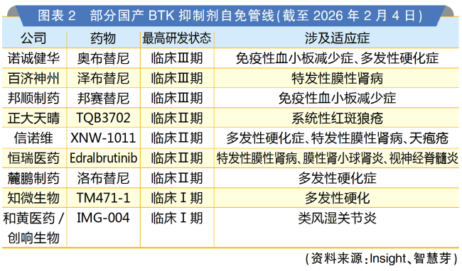 自免疾病作为仅次于肿瘤的全球第二大市场,一直是药企的必争之地。BTK抑制剂在自免领域的巨大潜力吸引了众多药企布局,其中不乏艾伯维、赛诺菲、诺华、礼来、阿斯利康、罗氏等制药巨头。在这场全球竞速中,国产力量也在跟进,已布局的企业包括百济神州、诺诚健华、正大天晴、恒瑞医药等。从研究进度来看,诺诚健华、百济神州、邦顺制药的产品处于第一梯队,均已进入Ⅲ期阶段。