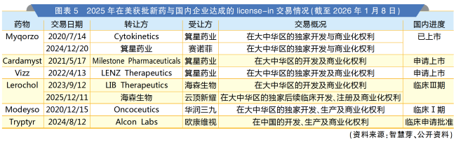 据不完全统计,除了阿夫凯泰,还有5个2025年在美获批上市的新药已达成与国内药企的license-in交易。其中,箕星药业分别于2021年、2022年引进的阵发性室上性心动过速治疗药物Cardamyst与老花眼治疗药物Vizz进展最快,均已在国内提交了上市申请。此外,从LIB Therapeutics引进的第三代PCSK9抑制剂Lerochol已进入Ⅲ期临床阶段,华润三九引进的抗肿瘤新药Modeyso与欧康维视引进的干眼症新药Tryptyr尚处于早期阶段。