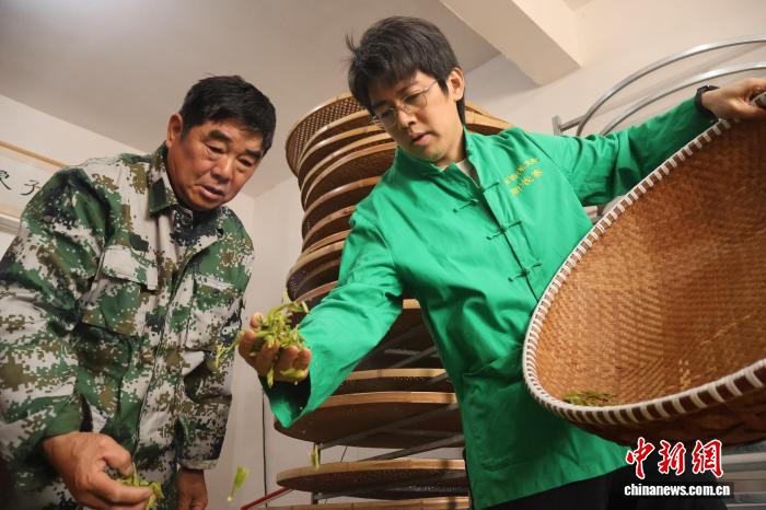 “西湖龙井炒茶大师”俞子良(左)及其儿子俞华平(右)摊晾刚采摘的西湖龙井茶。中新社记者 鲍梦妮 摄