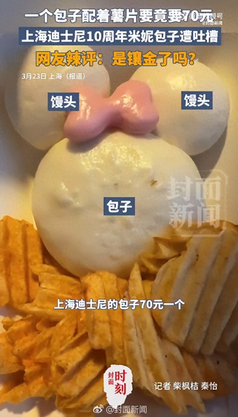 上海迪士尼的物价遭吐槽 70元米妮包子引争议!3月24日,上海迪士尼70元一个包子的定价引发网友热议,许多人认为价格过高。网友发布的图片显示,迪士尼十周年套餐包括一个形似米妮的蒸包子和若干薯片,售价70元。该网友表示,“米妮”包子头部有馅,味道像酱肉包,但耳朵部分没有馅。