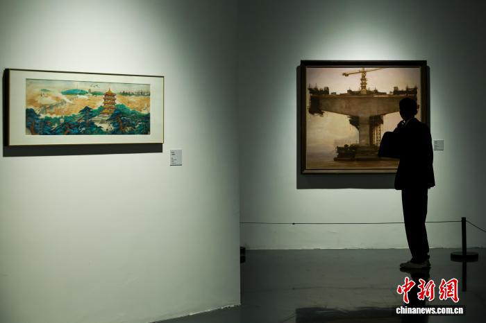 4月1日,湖北武汉,观众参观展出的油画作品《长江大桥》。 中新社记者 张畅 摄